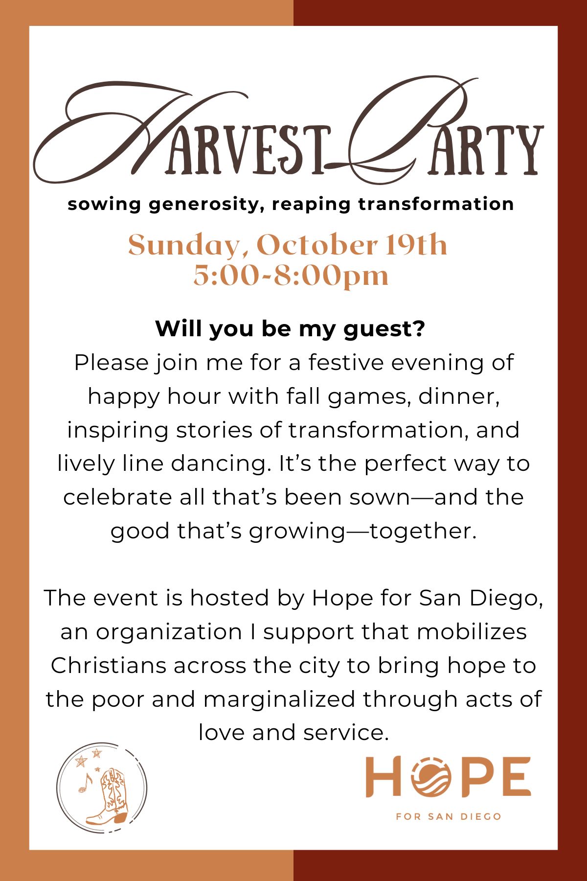 Join us this fall for a harvest celebration filled with gratitude, connection, and fun! We’ll honor the generosity of our Hope Partners and welcome new friends into the Hope for San Diego community.